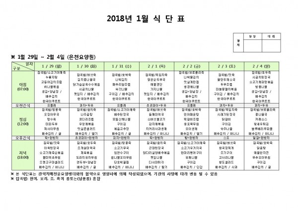 1월 다섯째주 식단표 페이지 정보 작성자 은천노인복지회 작성일18-01-31 13:35 조회192,030회 댓글0건 관련링크 이전글 다음글 목록 답변 본문 1월 다섯째주 식단표 이전글 다음글 목록 답변