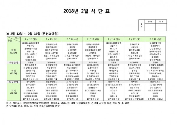 2월 둘째주 식단표 페이지 정보 작성자 은천노인복지회 작성일18-02-12 11:15 조회192,655회 댓글0건 관련링크 이전글 다음글 목록 답변 본문 2월 둘째주 식단표 이전글 다음글 목록 답변