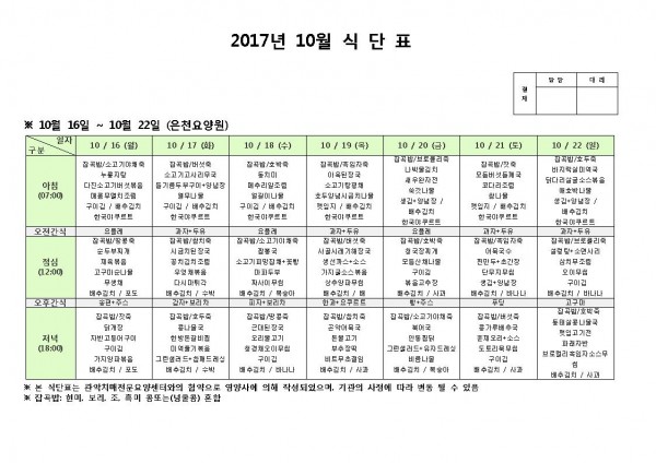 10월 셋째주 식단표 페이지 정보 작성자 은천노인복지회 작성일17-10-17 17:39 조회182,202회 댓글0건 관련링크 이전글 다음글 목록 답변 본문 10월 셋째주 식단표 이전글 다음글 목록 답변