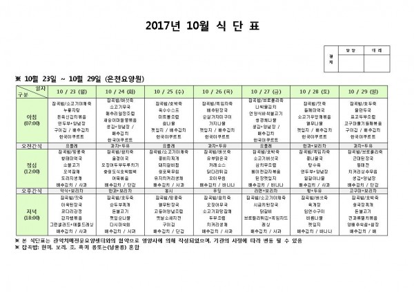 10월 넷째주 식단표 페이지 정보 작성자 은천노인복지회 작성일17-10-23 11:19 조회183,148회 댓글0건 관련링크 이전글 다음글 목록 답변 본문 10월 넷째주 식단표 이전글 다음글 목록 답변