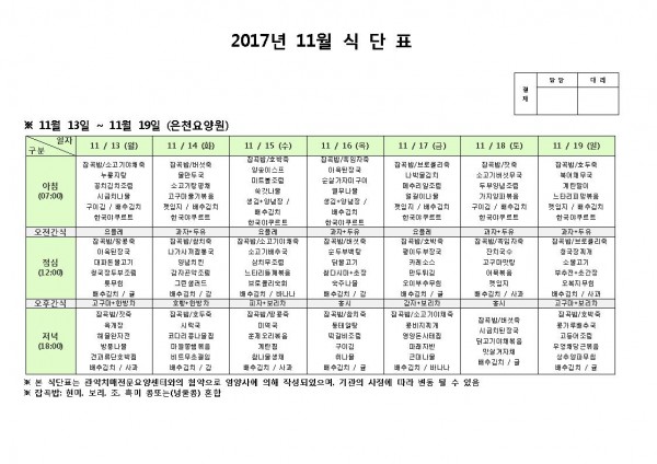 11월 셋째주 식단표 페이지 정보 작성자 은천노인복지회 작성일17-11-13 17:29 조회183,599회 댓글0건 관련링크 이전글 다음글 목록 답변 본문 11월 셋째주 식단표 이전글 다음글 목록 답변