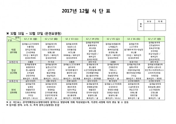 12월 셋째주 식단표 페이지 정보 작성자 은천노인복지회 작성일17-12-11 10:18 조회186,858회 댓글0건 관련링크 이전글 다음글 목록 답변 본문 12월 셋째주 식단표 이전글 다음글 목록 답변