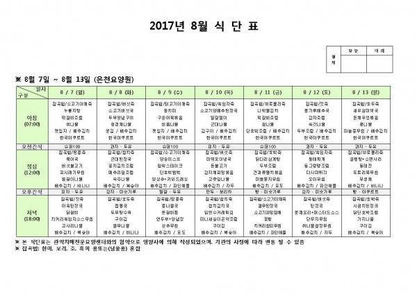 8월 둘째주 식단표 페이지 정보 작성자 은천노인복지회 작성일17-08-07 09:46 조회179,120회 댓글0건 관련링크 이전글 다음글 목록 답변 본문 8월 둘째주 식단표 이전글 다음글 목록 답변