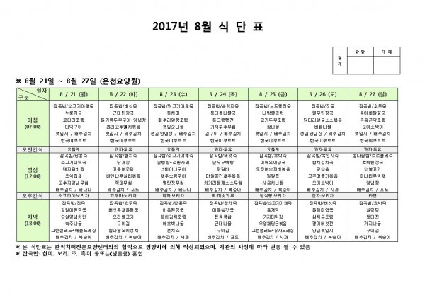 8월 넷째주 식단표 페이지 정보 작성자 은천노인복지회 작성일17-08-21 10:51 조회178,628회 댓글0건 관련링크 이전글 다음글 목록 답변 본문 8월 넷째주 식단표 이전글 다음글 목록 답변