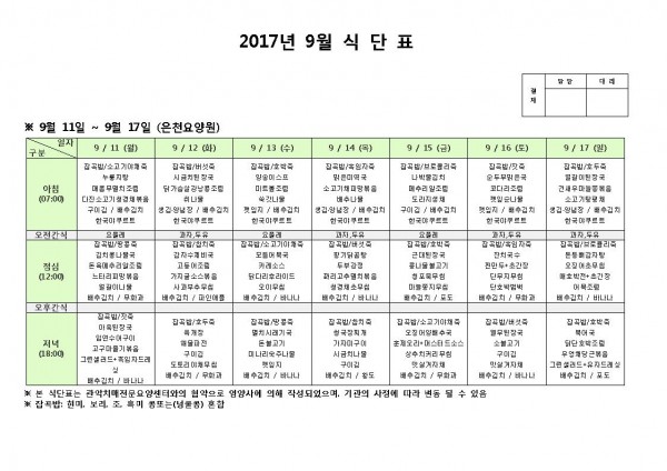 9월 둘째주 식단표 페이지 정보 작성자 은천노인복지회 작성일17-09-11 17:01 조회179,958회 댓글0건 관련링크 이전글 다음글 목록 답변 본문 9월 둘째주 식단표 이전글 다음글 목록 답변