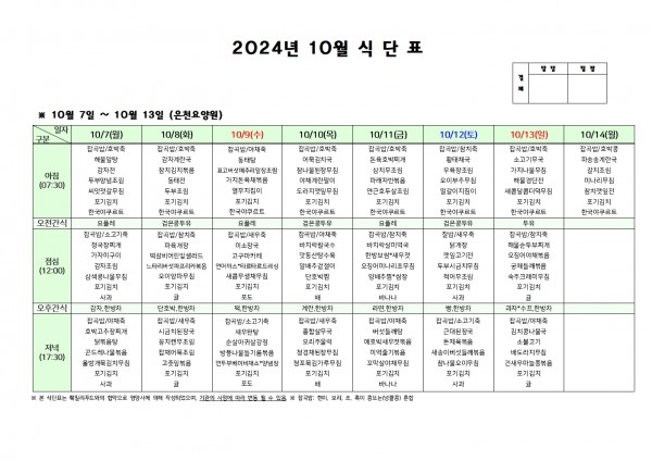 10월 둘째주 식단표 페이지 정보 작성자 은천노인복지회 작성일24-10-04 11:48 조회18,943회 댓글0건 관련링크 이전글 다음글 목록 답변 본문 . 이전글 다음글 목록 답변