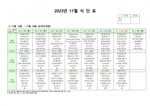 11월 셋째주 식단표 페이지 정보 작성자 은천노인복지회 작성일23-11-10 13:17 조회35,152회 댓글0건 관련링크 이전글 다음글 목록 답변 본문 . 이전글 다음글 목록 답변