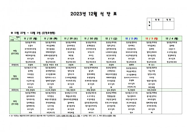 12월 첫째주 식단표 페이지 정보 작성자 은천노인복지회 작성일23-11-24 09:37 조회33,336회 댓글0건 관련링크 이전글 다음글 목록 답변 본문 . 이전글 다음글 목록 답변