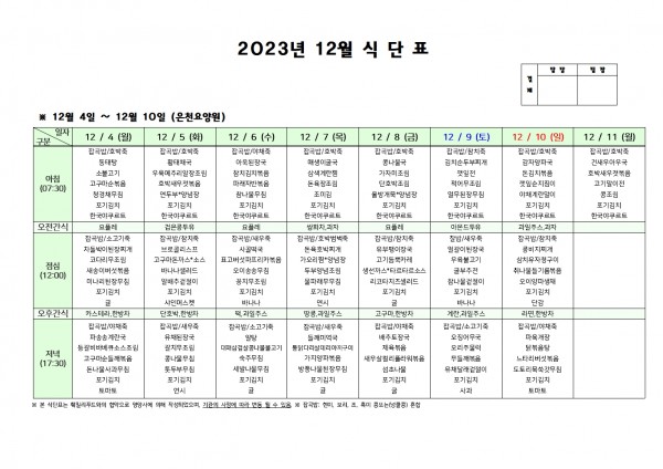 12월 둘째주 식단표 페이지 정보 작성자 은천노인복지회 작성일23-12-01 16:35 조회31,431회 댓글0건 관련링크 이전글 다음글 목록 답변 본문 . 이전글 다음글 목록 답변