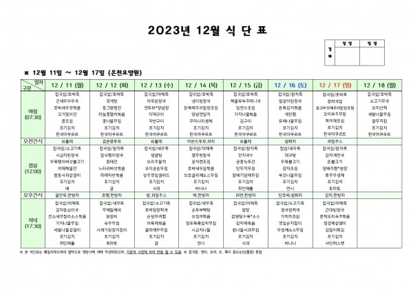 12월 셋째주 식단표 페이지 정보 작성자 은천노인복지회 작성일23-12-08 13:03 조회33,788회 댓글0건 관련링크 이전글 다음글 목록 답변 본문 . 이전글 다음글 목록 답변