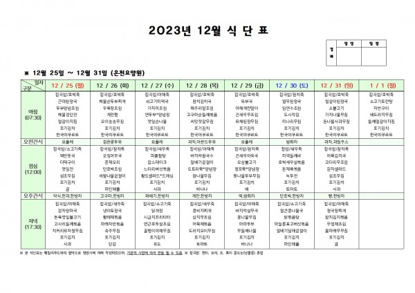 12월 다섯째주 식단표 페이지 정보 작성자 은천노인복지회 작성일23-12-22 15:50 조회32,222회 댓글0건 관련링크 이전글 다음글 목록 답변 본문 . 이전글 다음글 목록 답변