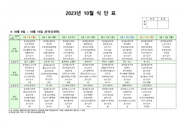 10월 둘째주 식단표 페이지 정보 작성자 은천노인복지회 작성일23-10-05 17:41 조회35,911회 댓글0건 관련링크 이전글 다음글 목록 답변 본문 . 이전글 다음글 목록 답변