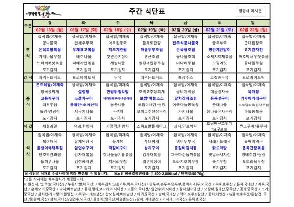 2월 셋째주 식단표 페이지 정보 작성자 은천노인복지회 작성일26-02-12 17:43 조회157회 댓글0건 관련링크 다음글 목록 답변 본문 2월 셋째주 어르신 식단표 안내해 드립니다. 정성과 영양을 담아 준비하겠습니다. 다음글 목록 답변