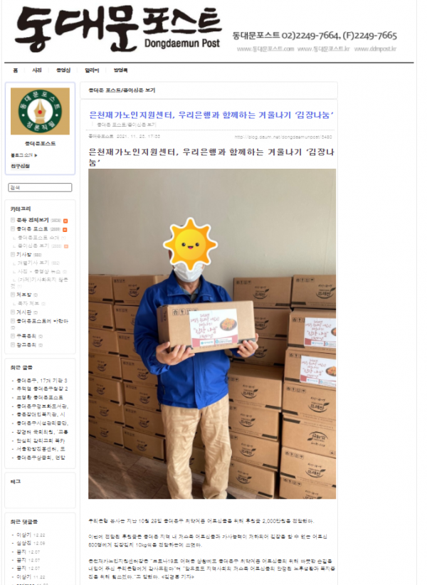 동대문포스트 김장기사 페이지 정보 작성자 은천노인복지회 작성일21-12-29 17:25 조회9,074회 댓글0건 관련링크 https://blog.daum.net/dongdaemunpost/3480 5395회 연결 목록 답변 본문 동대문포스트에 김장나눔 행사 기사입니다~ 목록 답변