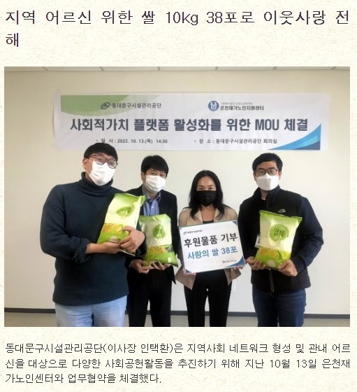 은천재가노인지원센터와 시설관리공단의 협약체결 페이지 정보 작성자 은천노인복지회 작성일22-11-09 16:58 조회8,492회 댓글0건 관련링크 https://blog.naver.com/news500/222901633880 4547회 연결 목록 답변 본문 동대문시설관리공단과 은천재가노인지원센터와 협약을 체결하였습니다앞으로 상호 협조하여 어르신의 행복한 노후를 위하여 계속 노력하겠습니다. 목록 답변