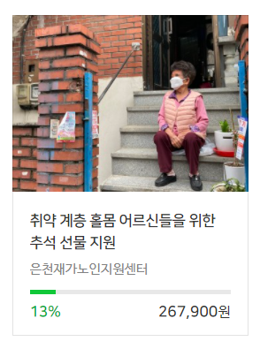 취약계층 어르신을 위한 추석선물 모금활동 페이지 정보 작성자 은천노인복지회 작성일21-08-23 10:22 조회29,503회 댓글0건 관련링크 https://happybean.naver.com/donations/H000000178857 21679회 연결 목록 본문 취약계층 어르신의 추석선물 지원을 위해 해피빈에서 모금활동을 하고 있습니다~ 모금활동에 많은 동참을 부탁드립니다~ 목록