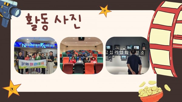 [서울시동대문구재가노인복지기관] 5월 문화체험활동 '영화관람' 페이지 정보 작성자 은천노인복지회 작성일25-06-11 14:39 조회2,754회 댓글0건 관련링크 이전글 다음글 목록 답변 본문 촬영소 사거리에 위치한 '답십리영화미디어아트센터'에서 영화 관람을 진행하였습니다! 이전글 다음글 목록 답변