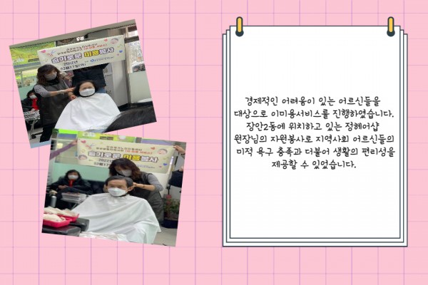 [재가노인지원서비스] 이미용 서비스 페이지 정보 작성자 은천노인복지회 작성일22-03-30 14:02 조회18,261회 댓글0건 관련링크 이전글 다음글 목록 답변 본문 3월 이미용 서비스 이전글 다음글 목록 답변