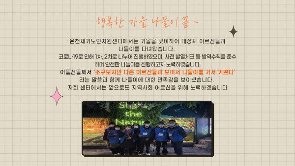 [재가노인지원서비스] 2021년 가을나들이 페이지 정보 작성자 은천노인복지회 작성일21-12-15 16:01 조회19,964회 댓글0건 관련링크 이전글 다음글 목록 답변 본문 2021년 재가노인지원서비스 대상 어르신 가을나들이 이전글 다음글 목록 답변